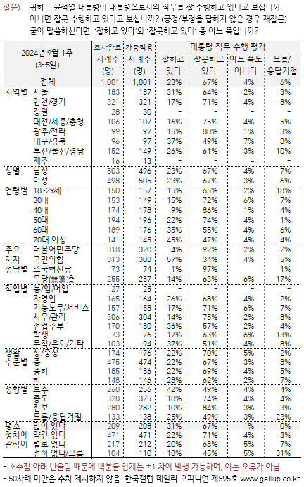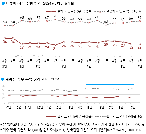 한국갤럽이 2024년 9월 3~5일 전국 18세 이상 유권자 1,001명을 대상으로 조사한 여론조사에서 윤 대통령의 직무 수행 부정 평가는 지난주 66%에 이어 67%로 더 늘어났습니다. 윤 대통령 지지율은 4월 총선 이후 15번의 갤럽 조사에서 계속 긍정 20%대, 부정 60%대를 기록 중이며 최근 들어 조금씩 더 나빠지고 있습니다.