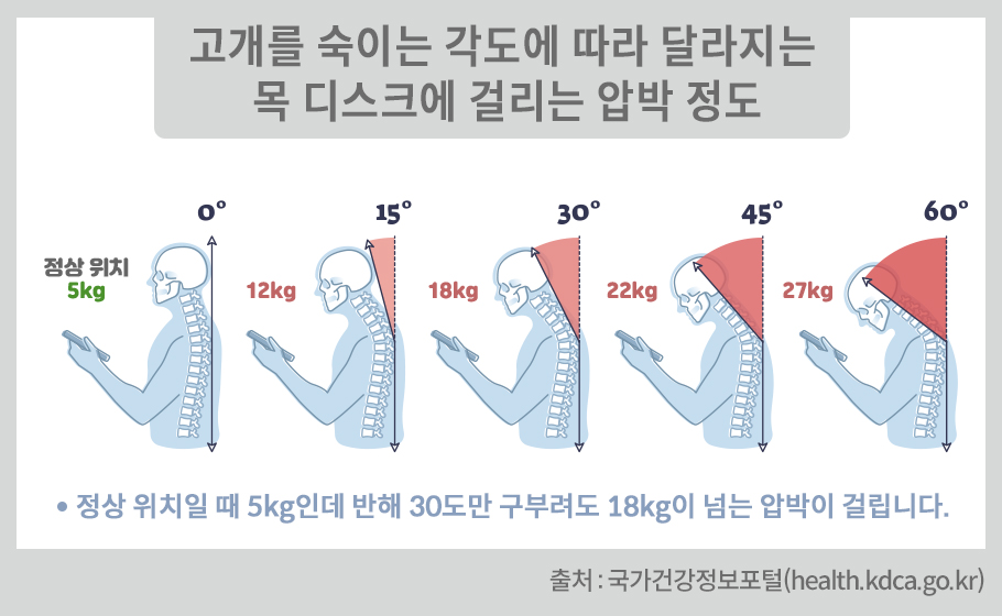거북목은 허리와 등, 목이 앞으로 구부러지면서 머리를 앞으로 내밀어 거북이처럼 하고 있는 상태를 말합니다. 정상적인 목은 앞으로 휘어지는 C자 모양의 곡선을 그립니다. 그래야 앉거나 서 있을 때 머리의 무게가 목뼈의 중심을 지나 목 디스크에 걸리는 압력을 줄여준다고 합니다. 거북목은 목 디스크가 손상되면서 목뼈들이 일직선이 되는 일자목 상태가 됩니다. 이 경우 목의 움직임은 30% 가량 줄어들고 목 디스크에 걸리는 압력이 많게는 90%까지 증가한다고 합니다. 목 디스크를 손상시키는 주범이 거북목입니다. 거북목은 어떻게 생기는지, 생겼을 경우에는 어떻게 대처해야 하는지 질병관리청 자료로 알아보겠습니다.