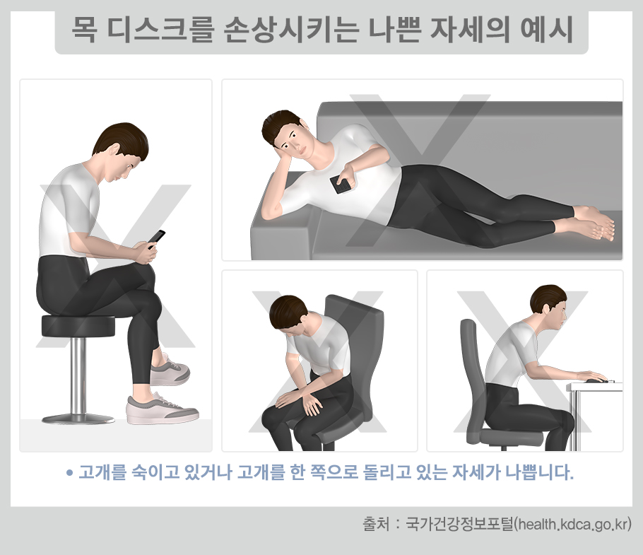 오랫동안 잘못된 자세로 컴퓨터나 스마트폰을 사용하다가 거북목이 되는 경우가 많습니다. 거북목이 되면 목 디스크가 손상되는 것은 시간문제입니다. 목 디스크가 손상되면 처음에는 목덜미와 어깻죽지가 뻐근하다가 더 심해지면 팔도 저리고, 시리고, 근육 속이 아픈 통증이 생깁니다. 더 심해지면 잠을 자기 힘들 정도가 됩니다. 팔 힘이 약해지는 증상이 생길 때 빨리 전문의의 진찰을 받아야 합니다. 목덜미와 어깻죽지만 아픈 초기 상태에서는 자세를 바꾸고 좋은 동작을 하면 낫는다고 합니다. 가장 나쁜 자세는 고개를 숙이고 있거나 고개를 한 쪽으로 돌리고 있는 자세입니다.