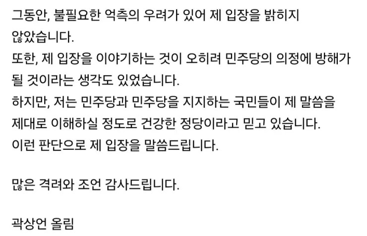 검사 4명 탄핵소추 조사를 법사위에 회부하자는 국회 본회의 표결에서 민주당 당론과 다르게 검사 1명에 대해 기권표를 던진 곽상언 의원(노무현 대통령 사위)이 논란이 커지자 7월 6일 페이스북에 입장문을 올렸습니다. 해당 검사는 이화영 술자리 회유 의혹이 있는 수원지검 박상용 부부장입니다.