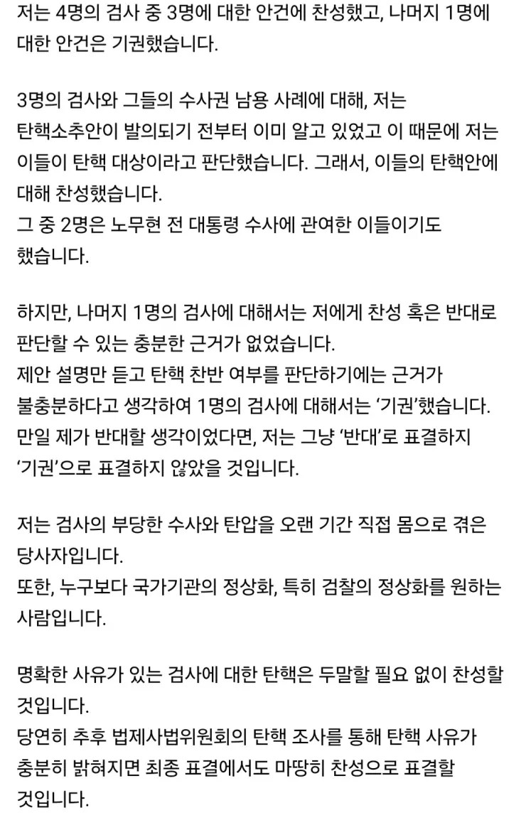 곽 의원은 이 해명글에서 국회의 검사 탄핵은 적법한 권한 행사라면서도 박상용 검사 건에 대해서는 내용을 정확히 알지 못해 부득이 찬성도 반대도 아닌 기권을 선택했다고 말했습니다. 사정이 그렇다면 아무리 당론이더라도 국회의원의 양심에 따라 기권을 택할 수도 있을 것입니다. 당론을 앞세운 국회의원의 집단 행동은 필요할 때도 있지만, 권위주의 정치문화의 일종이므로 무조건적으로 따라야 한다고 말하는 것은 옳지 않습니다. 다만 당론으로 이 안건이 채택될 때까지 내용 파악도 제대로 하지 않은 무책임에 대해서는 변명할 말이 없을 것 같습니다. 아래 입장문입니다.