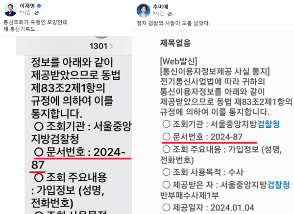 검찰은 공문으로 통신사 등에 통신이용자 정보 조회를 요청하는데, 현재까지 서울중앙지검 반부패수사1부의 무차별 통신자료 조회와 관련된 공문은 문서번호가 2024-87, 2024-116, 2024-117 등으로 기재된 3건으로 파악됐다. 문서번호 2024-87은 지난 1월 4일에, 나머지 문서번호 2건은 1월 5일에 각각 통신자료가 제공된 것으로 나타났다.
