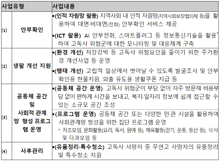 보건복지부는 1인 가구 증가와 사회관계망의 약화로 심화되는 사회적 고립과 고독사 문제에 대응하기 위해 2022년 8월부터 시행된 시범사업을 통해 고독사 위험자 조기 발견, 안부확인 및 생활개선 지원 등 고독사 예방·관리 서비스를 제공해 왔다. 서비스는 구체적으로 ▲ 안부확인, ▲ 생활 개선 지원, ▲ 공동체 공간 및 사회적 관계망 형성 프로그램 운영, ▲ 사후관리(유품정리, 특수청소) 등의 서비스로 구성된다.