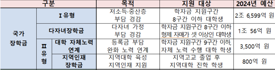 교육부는 지난 2월 1일 올해 학비부담을 덜어주는 2024년 맞춤형 국가장학금 지원 기본계획을 발표했다. 이번 계획의 대상은 국가장학금·대학생 근로장학사업·우수학생 국가장학사업 등 대학생 대상 지원 사업이다. 이미 신청한 학생들도 있겠지만, 아직 못한 학생들은 지원자격과 내용을 확인하고 늦지 않게 신청해야 한다. 올해 전체 국가 장학금 지원 내용을 정리했다.