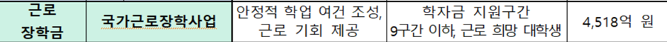또, 근로장학생 지원자격도 확대한다. 더 많은 학생들이 근로장학제도를 통해 직무경험을 쌓을 수 있도록 근로장학금 지원자격을 학자금 지원 9구간 이하로 대폭 늘린다. 공공기관, 민간 우수기업 등 학생들이 선호하는 근로지를 확대하여 근로장학제도를 통해 내실 있는 근로 경험을 할 수 있도록 지원할 계획이다.