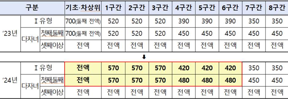 우선 기초·차상위 단계의 모든 자녀에게 등록금 전액을, 학자금 지원 1~3구간과 4~6구간의 지원단가를 인상하여 저소득층을 두텁게 지원한다. 특히, 올해는 학자금 지원 1~3구간 지원 단가를 50만원, 학자금 지원 4~6구간의 지원 단가를 30만원 인상해 지원금액을 상향조정했다. 다자녀의 경우 셋째 아이부터는 등록금을 전액 지원한다.