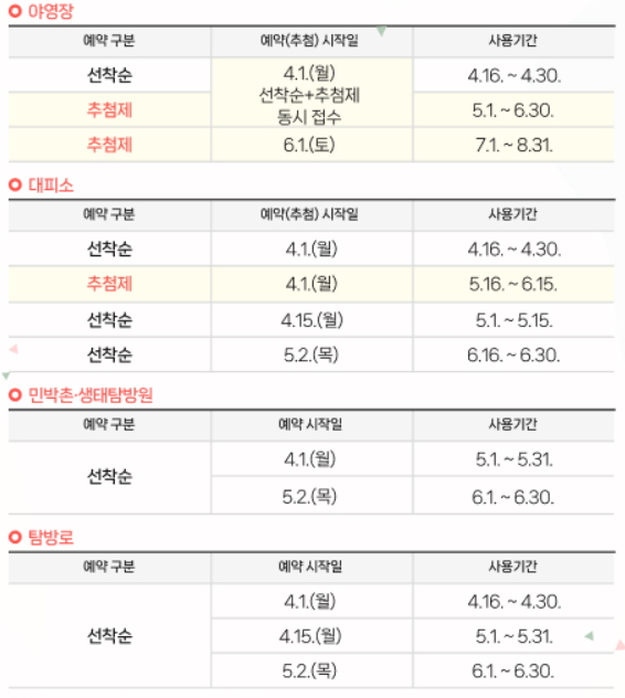 그다음은 6월에 진행한다. 6월 1일부터 5일까지 접수된 7월 1일부터 8월 30일까지의 사용일 희망자를 추첨한다. 추첨 당첨 후 취소 등의 사유로 예약가능 한 시설이 발생한 경우, 추첨결과 발표일 2일 후 부터 이용(예정)일까지 선착순 방식으로 예약할 수 있다.