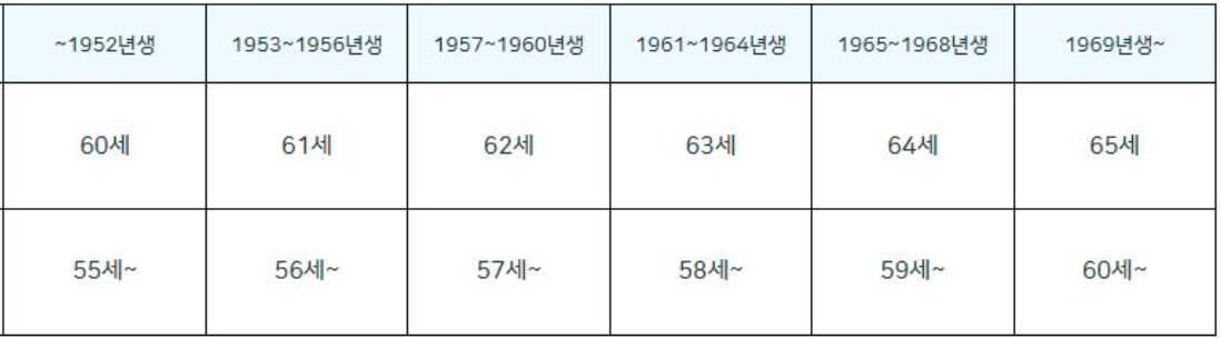 현재 국민연금(노령연금) 수령 개시 나이는 연령별로 다릅니다. 1952년 이전 출생한 사람은 60세부터 수령을 받고 있고 그보다 나이가 적은 사람은 3살 간격으로 1년씩 수령 나이가 늦춰집니다. 1969년생 이후부터는 65세에 연금을 받게 됩니다.