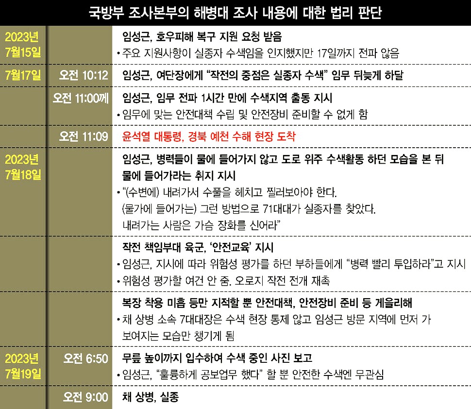 "지휘관으로 무한한 책임을 통감하며 수변 수색작전 개념을 7여단장을 통해 대대장들에게 인식시키지 못한 점, 하천에서의 위험성을 판단하고 예측하지 못한 점, 현장 작전제대에서 사전적인 안전조치가 이뤄질 수 있도록 시스템을 구축하지 못한 점이 아쉽다고 하나, 사고부대가 물에 들어간 것이 이번 사고의 가장 큰 문제점이라 생각한다는 진술임"