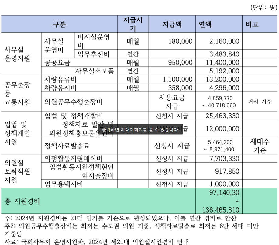 - 의원실 운영비로는 사무실 운영과 공무출장, 입법·정책지원 등에 최대 1억 3,647만원까지 쓸 수 있다.