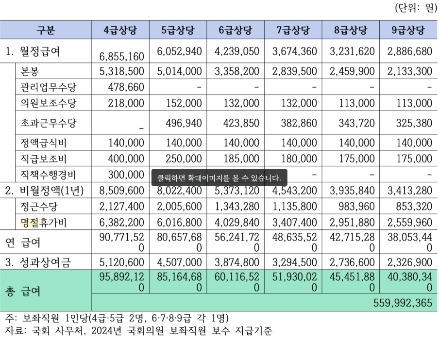 - 의원실 보좌진 9명에게 지급되는 급여는 연간 5억 6천만원에 이른다. 4급 보좌관의 경우 성과상여금을 포함해 9,589만원을 받는다.