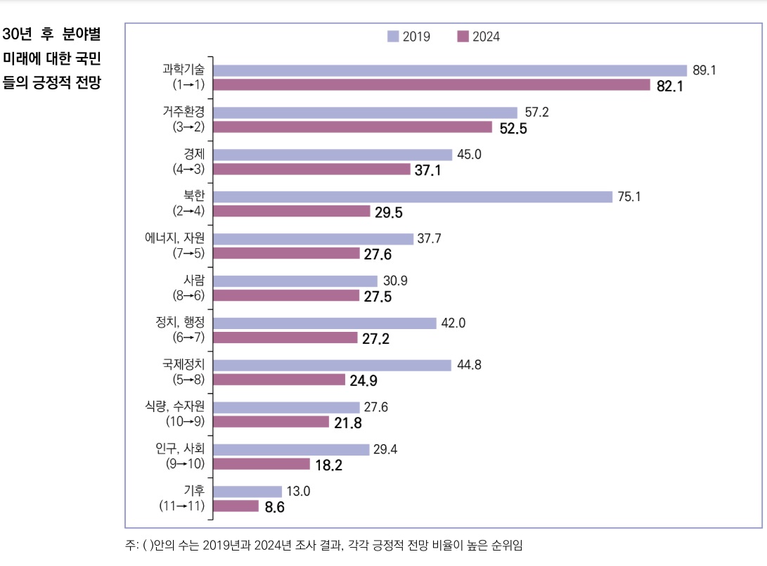 국회미래연구원이 30년 후 분야별 미래 전망을 주제로 최근 3,000명을 온라인 설문조사 한 결과 미래에 대한 긍정적 전망치는 11개 전 분야에서 5년 전보다 낮아졌다고 합니다.