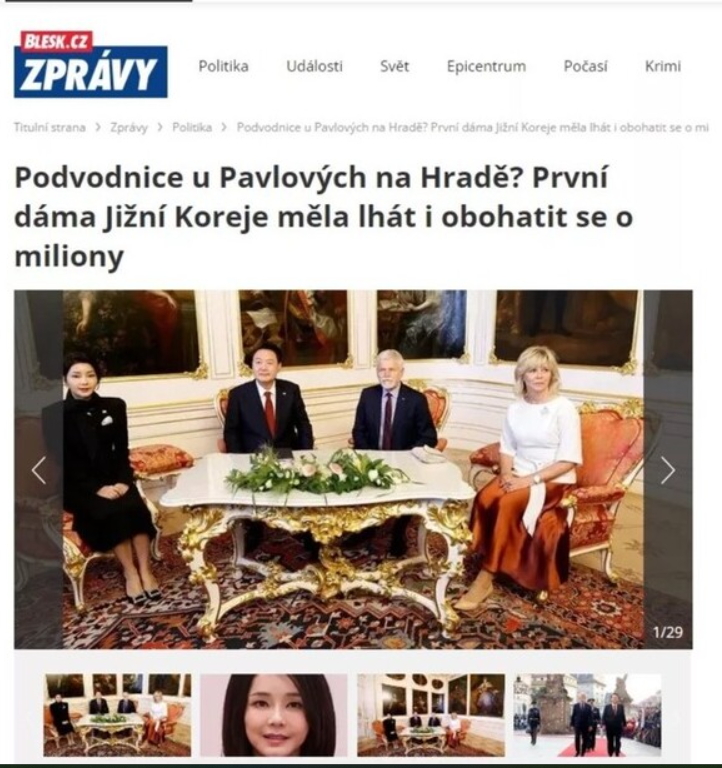 <시민언론 민들레>는 9월 23일 체코 제1위 타블로이드 신문인 ‘블레스크’(BLESK. 번개)는 21일 자 기사에서 “한국의 대통령은 그 곁에 사기꾼(podvodnik)을 데리고 있는가?” 라는 자극적인 제목의 기사를 싣고, 김건희 여사의 세금 체납, 표절, 학력 위조, 주가조작, 그리고 검찰 부실 수사 의혹 등을 상세히 소개해 논란이 일었다고 보도했다. 윤 대통령과 김 여사는 이틀간의 체코 국빈방문 일정을 마치고 이날 귀국길에 올랐다.