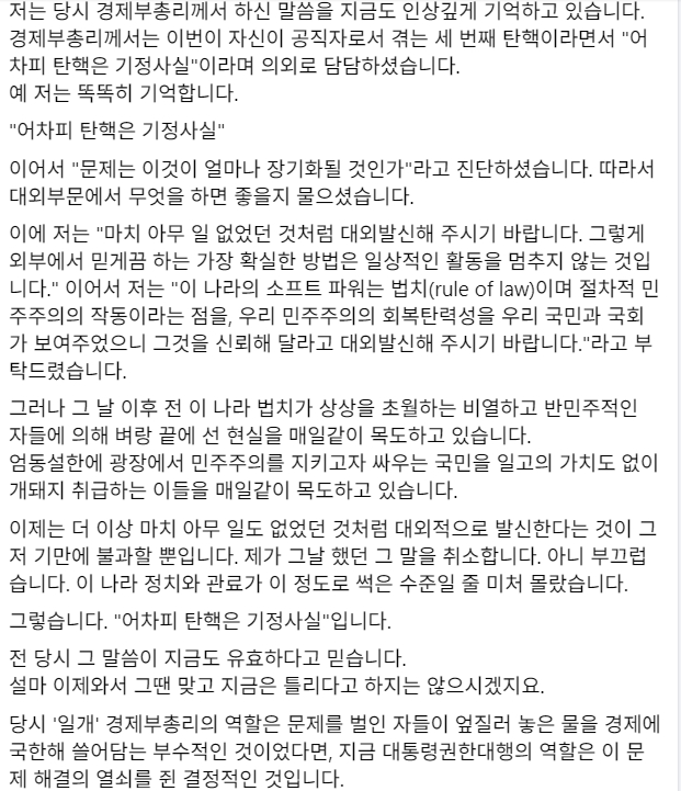김양희 대구대 경제금융학부 교수는 28일 자신의 페이스북에 지난 6일 서울 정부서울청사에서 열린 ‘대외경제자문회의’에서 최 권한대행의 비공개 발언 내용을 일부 소개했다. 김 교수는 “비공개회의 석상에서 한 발언이었으나 워낙 엄중한 시국이라 불가피하게 일부 발언을 공개함을 양해 바란다”고 했다.
