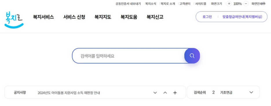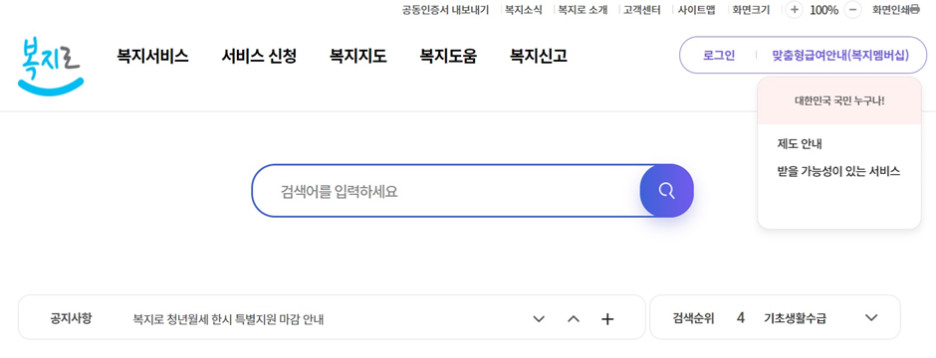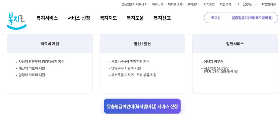① 인터넷 복지 포털 사이트인 ‘복지로’ 첫 화면에서 오른쪽 위에 있는 ‘맞춤형 급여안내(복지멤버십)’를 클릭합니다.