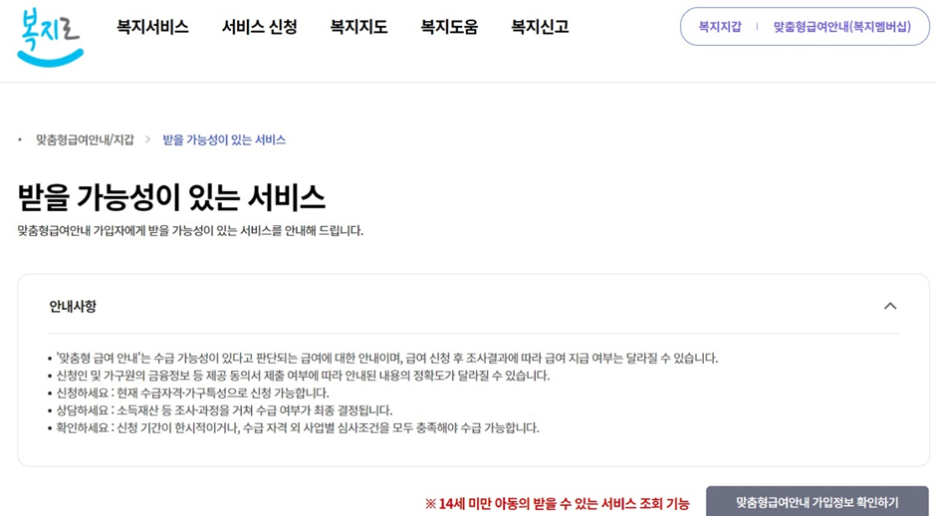 ⑥ 가입 완료 안내문과 함께 바로 자신에게 알맞은 복지 서비스 내용을 확인할 수 있습니다.
