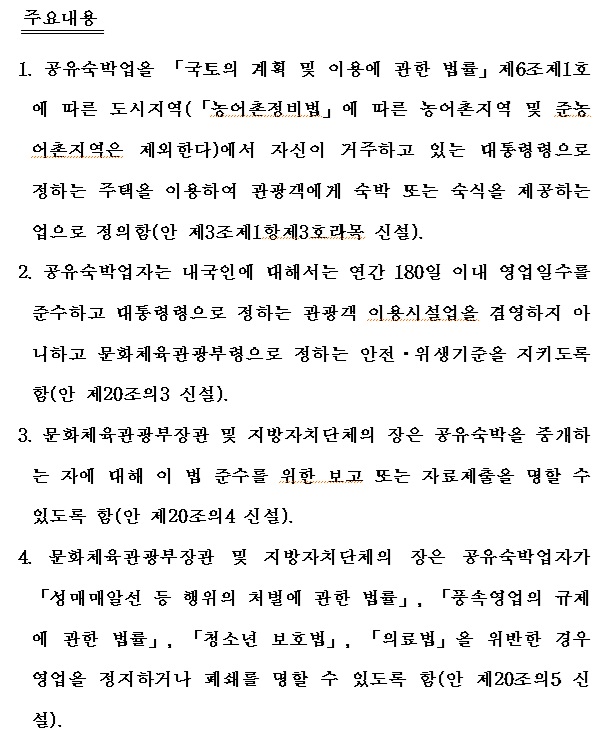 3년 전 유정주 의원이 대표 발의한 관광진흥법 개정안은 현재 외국인만을 대상으로 하는 도시 공유 숙박을 내국인에게도 전면 허용하되 연간 영업일수를 180일로 제한하는 내용을 담고 있습니다. 이같은 공유 숙박업을 하는 사람은 정부 시행령에서 정한 관광객 이용시설업을 같이 경영해서는 안 됩니다. 정부 시행령에서 정하는 안전·위생 기준을 지켜야 하며 공유 숙박 시설을 모아서 소개하는 중개업자는 정부가 시설 기준 관련 자료 제출이나 보고를 요구할 경우 이에 응해야 합니다. 또 이런 시설이 ‘성매매 알선 처벌법’ ‘풍속영업 규제법’ ‘청소년보호법’ ‘의료법’을 위반한 경우 문체부 장관이나 지방자치단체장이 영업을 정지하거나 폐쇄할 수 있도록 한다는 내용입니다.