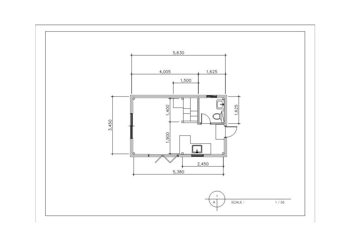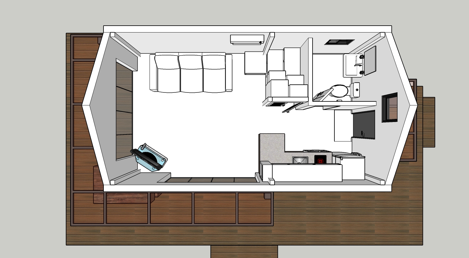 건축회사인 아인스홈이 블로그에 공개한 설계도로 6평 농막 설계도로 가장 흔하게 볼 수 있는 디자인입니다. 욕실과 주방 위로 다락이 있어 침실 공간으로 쓸 수 있습니다. 해당 블로그(https://m.blog.naver.com/einshaven/222066631420)에서 더 자세한 내용을 볼 수 있습니다.