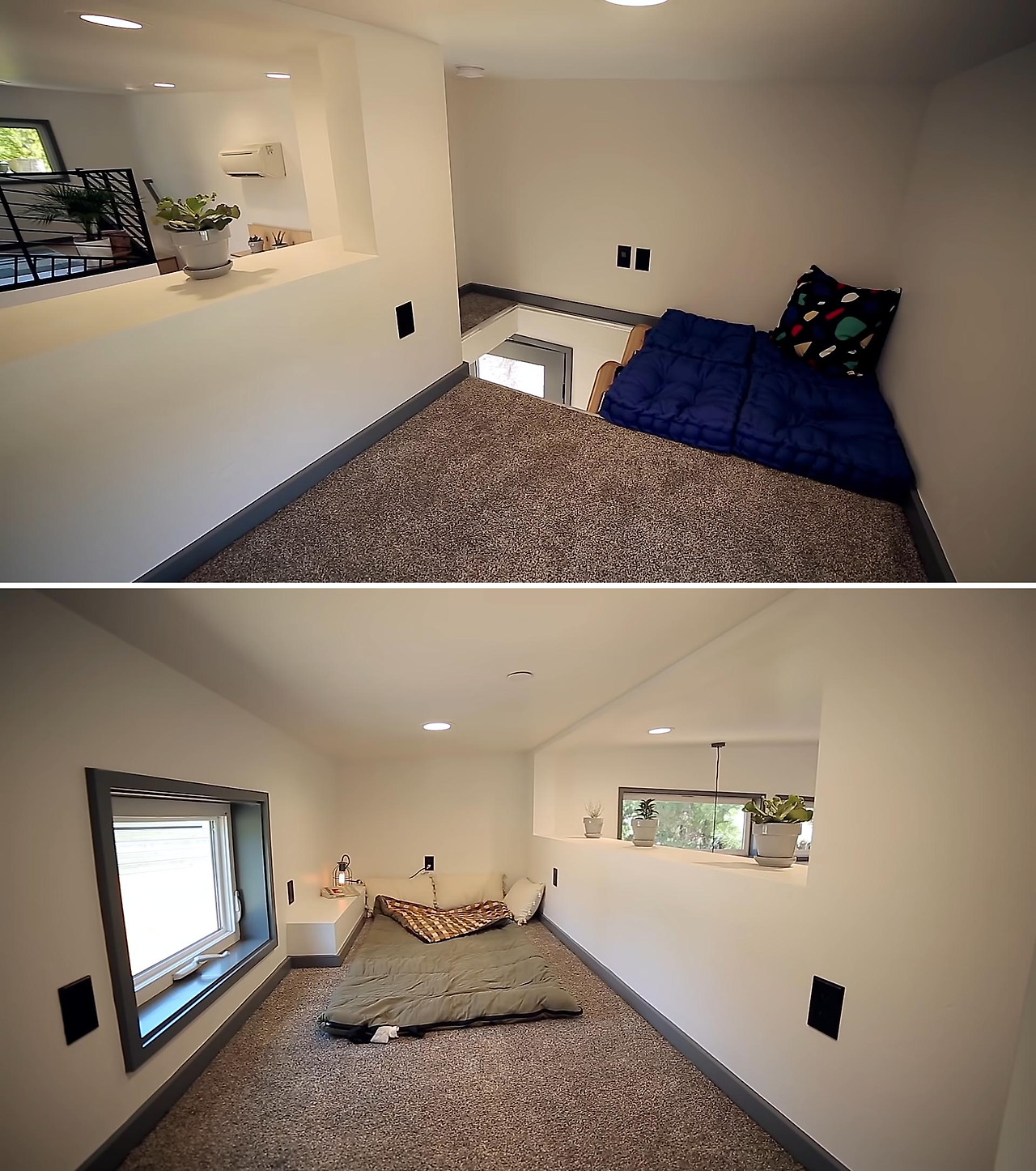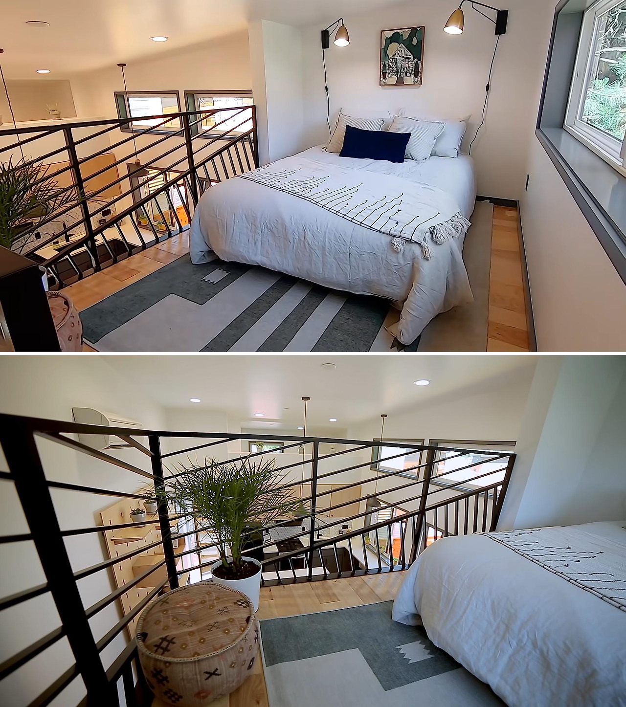 건축 바닥면적이 6평이라는 게 믿기지 않을 정도로 잘 정돈되고 효율적인 구조입니다. 다락의 침대 공간을 마치 방 2개를 둔 것처럼 분리해 4명이 잘 수 있도록 했습니다.