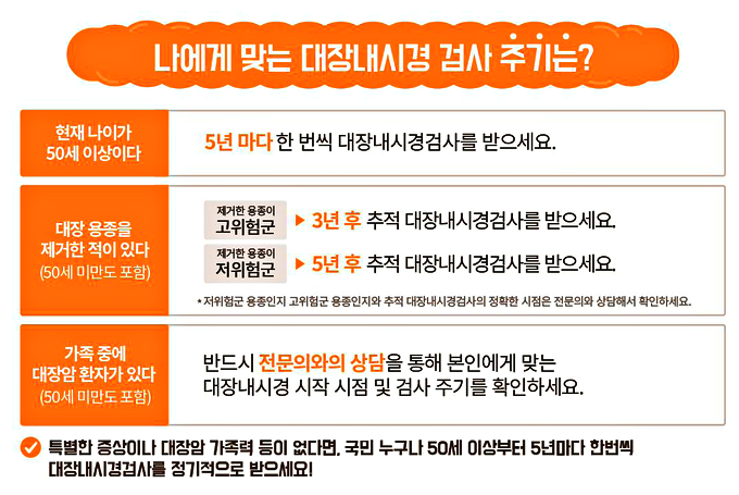 "독일 암 연구 센터 마흐디 팔라 박사가 이끄는 다국적 연구진은 최근 이 같은 내용의 연구 결과를 미국의학협회 종양학 학술지(JAMA Oncology)를 통해 공개했다...팔라 박사 등 연구진은 스웨덴 국가 등록 데이터를 통해 첫 대장내시경 검사에서 대장암 음성 결과가 나온 11만74명을 최대 29년까지 추적 조사했다. 그 결과, 음성 판정 후 10년마다 대장내시경 검사를 받은 사람과 15년 뒤 검사를 받은 사람이 추후 대장암 진단을 받거나 대장암으로 사망할 위험은 거의 차이가 없었다. 팔라 박사는 “대장내시경 주기를 10년에서 15년으로 늘릴 경우, 1000명당 2명이 조기 발견 사례를 놓치고 1000명당 1명이 사망 위험에 노출되는 것으로 조사됐다”며 “가족력이 없는 사람은 첫 대장내시경 검사에서 별다른 이상이 없으면 15년 뒤 재검사를 받아도 큰 문제가 없다는 것을 보여준다”고 했다." (기사 일부 발췌)