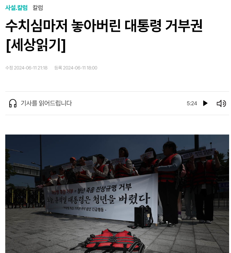 대통령이 이미 14번 국회가 통과시킨 법률에 대한 거부권을 행사했다. 헌정사상 전무후무한 일이 벌어지고 있다. 거부권 행사는 정당한 것일까? 이에 대해 알고 싶다면,<한겨레신문>이 11일 게재한 임재성 변호사의 "수치심마저 놓아버린 대통령 거부권" 칼럼을 한번 읽어보기를 권한다.