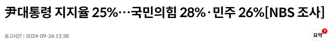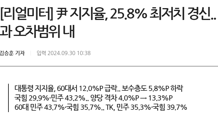 카테고리 없음 대통령 지지율 역대 최저치로 모이는 여론조사 결과들 by avo1 2024. 9. 30. 반응형 9월 4주차 발표된 한국갤럽, NBS, 리얼미터 등 3개 주요 여론 조사 기관이 발표한 대통령지지율이다. 김어준 대표가 운영하는 여론조사 '꽃'의 결과도 유사한 결과를 보여준다. 폴리뉴스 관련 기사 화면(출처: 폴리뉴스 홈페이지) 뉴스공장 유튜브 방송 화면 캡처(출처: 유튜브 채널 '겸손은 힘들다 뉴스공장') 연합뉴스 관련 기사 화면(출처: 연합뉴스 홈페이지) 경향신문 관련 기사 화면(출처:경향신문 홈페이지) 반응형 공유하기 게시글 관리 아보카도7