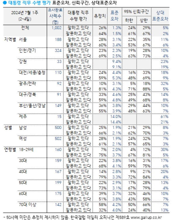 여론조사 전문기관 한국갤럽이 7월 5일 공개한 윤석열 대통령의 직무수행 평가 결과에 따르면, ‘직무수행을 잘하고 있다’는 긍정평가가 26%였고 ‘직무수행을 잘못하고 있다’는 부정평가는 64%를 기록했다. 의견을 유보한 비율은 10%였다(어느 쪽도 아님 3%, 모름/응답거절 7%).