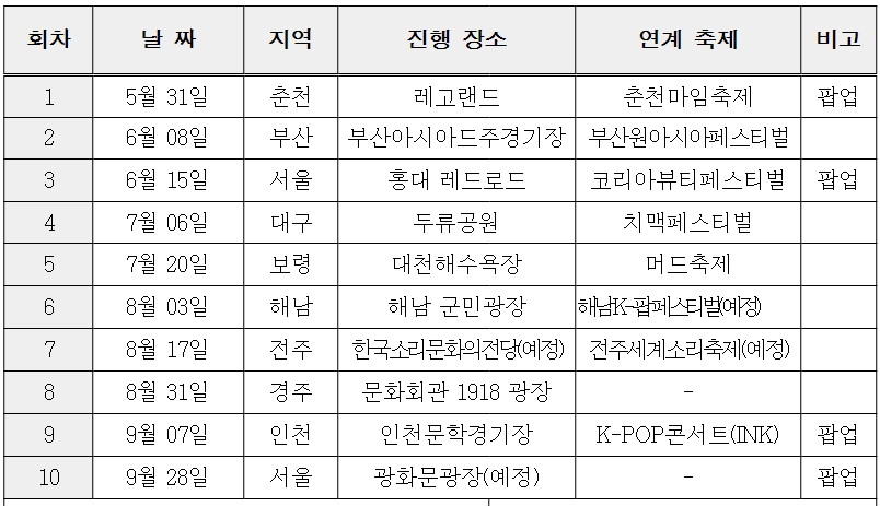 ‘케이-팝 플레이그라운드’는 ▴케이-팝 그룹, 유명 댄스팀과 함께 즐기는 ‘케이-팝 랜덤 플레이 댄스’ 대회와 ▴케이-콘텐츠(케이-팝, 케이-뷰티) 상품(굿즈) 전시, 케이-컬처 체험 행사 등을 제공하는 ‘케이-컬처 반짝 매장(팝업, 일부 지역 해당)’ 등을 함께 운영한다. 이번 행사는 5월 31일, 춘천(춘천마임축제)을 시작으로, ▴부산(6. 8. 부산원아시아페스티벌), ▴서울 홍대(6. 15. 코리아 뷰티 페스티벌), ▴대구(7. 6. 대구치맥페스티벌), ▴보령(7. 20. 보령머드축제), ▴해남(8. 3. 해남군민광장), ▴전주[8. 17. 세계소리축제(예정)], ▴경주(8. 31. 경주문화회관1918광장), ▴인천(9. 7. 인천K-POP콘서트), ▴서울 광화문[9. 28. 광화문광장(예정)] 등 총 10개 지역에서 펼쳐 ‘한국방문의 해’의 환대 분위기를 전국적으로 확산할 예정이다.