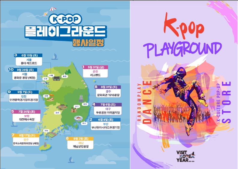 문화체육관광부는 (재)한국방문의해위원회와 함께 5월 31일(금)부터 9월 말까지 전국 유명 지역 축제와 관광지에서 ‘2024 한국방문의 해’ 주요 10대 사업 중 하나로‘케이-팝 플레이그라운드(K-POP PLAYGROUND)’ 행사를 개최한다.
