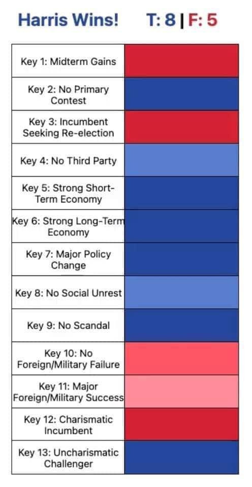 그가 기준으로 삼은 13가지 키는 ① 집권당의 입지 ② 대선 경선 ③ 후보의 현직 여부 ④ 제3 후보 ⑤ 단기 경제성과 ⑥ 장기 경제성과 ⑦ 정책 변화 ⑧ 사회 불안 ⑨ 스캔들 ⑩ 외교·군사 실패 ⑪ 외교·군사 성공 ⑫ 현직자의 카리스마 ⑬ 도전자의 카리스마입니다. 이 중에서 집권당이 8개 이상 유리하면 집권당 후보가 승리하고, 집권당이 6개 이상에서 불리하면 집권당 후보가 패배한다는 겁니다.