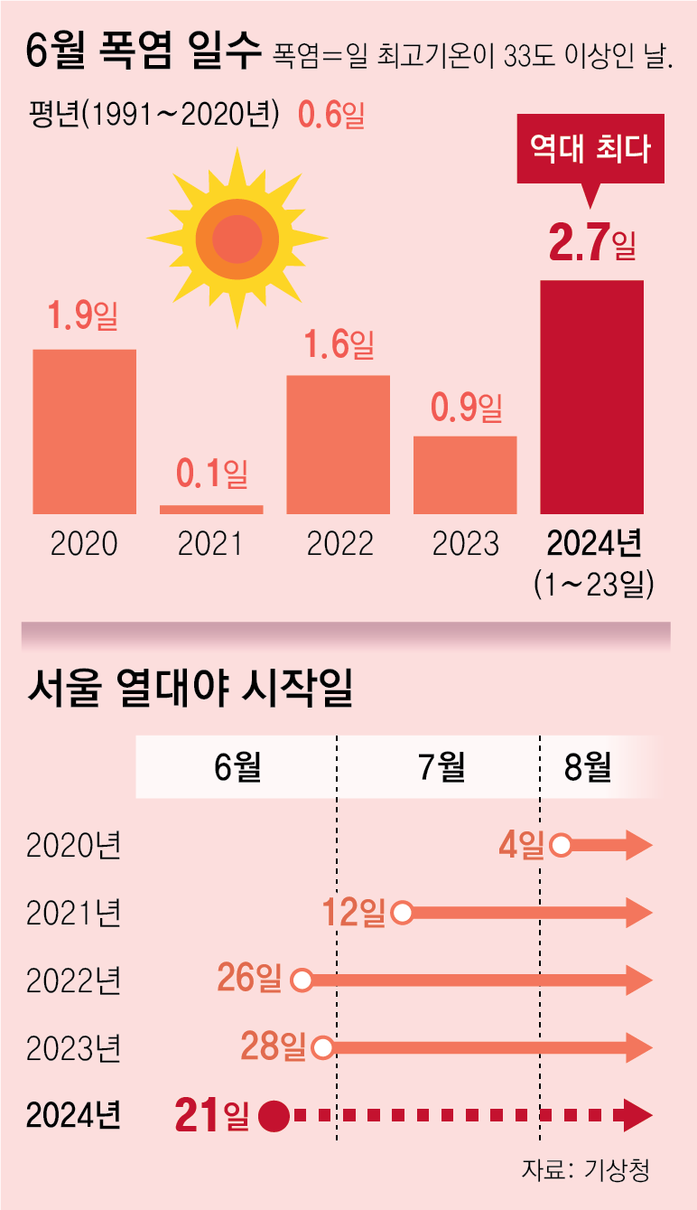 올 여름 열대야 시작일수가 관측 사상 가장 빠르고 6월 폭염 일수도 역대 최다라고 합니다. 기후변화가 점점 심해지면서 여름 더위가 점점 더 극심해지는 것 같습니다.