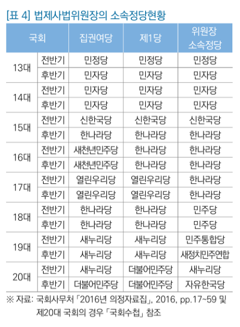 국회 원 구성 과정에서 또 다른 쟁점은 법제사법위원장을 어느 정당이 차지할 것인가이다. 이는 입법과정에서 법제사법위원회의 체계·자구심사가 필수절차라는 점과 관련되어 있다. 즉, 소관 상임위원회 심사를 마친 법안은 본회의에 부의되기 전에 법제사법위원회의 체계·자구심사를 반드시 거쳐야 하기 때문에 법사위원장의 권한과 역할이 크고, 따라서 원내교섭단체들이 서로 차지하고자 하는 위원장직이 되었다. [표 4]에는 제13대 국회 이후로 법제사법위원장의 소속정당이 나타나 있다. 제13대 국회부터 제16대 국회까지는 원내 제1당이 법사위원장을 차지하였다. 제17대 국회부터는 원내 제2당이 법제사 법위원장을 맡기 시작했다. 이때부터 소관 상임위원회를 통과한 법안의 심사가 법제사법위원회 체계자구심사 단계에서 지연되는 일이 빈번해졌고, 이로 인해서 체계·자구심사절차는 입법과정에서 또 다른 비토지점(veto point)으로 기능하고 있다는 비판이 제기되고 있다.