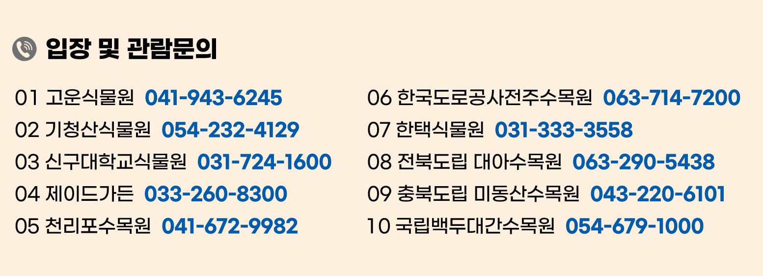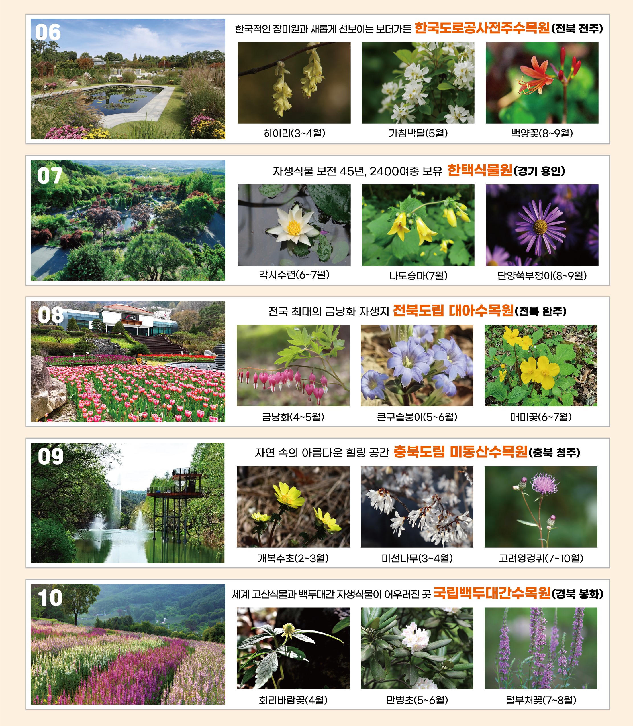 산림청이 사계절 내내 다양한 자연의 아름다움을 느낄 수 있는 '2024년에 꼭 가봐야 할 수목원 10선'을 최근 발표했습니다. 10선에 포함된 식물원은 △고운식물원(충남 청양) △기청산식물원(경북 포항) △신구대학교식물원(경기 성남) △제이드가든(강원 춘천) △천리포수목원(충남 태안) △한국도로공사전주수목원(전북 전주) △한택식물원(경기 용인) △대아수목원(전북 완주) △미동산수목원(충북 청주) △국립백두대간수목원(경북 봉화)입니다. 어떤 식물원들인지 산림청 자료로 알아봤습니다.