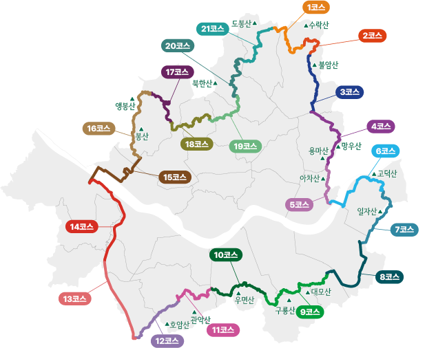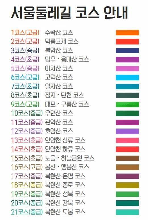 이번 코스 개편 이전인 2016년 서울연구원 조사에 따르면 서울둘레길 중 가장 인기 있는 코스는 북한산으로 21.7%, 그 다음으로 수락불암산 19.5%, 용마·아차산 15.2%였습니다. 21개 코스는 각각 어디인지, 어디서 출발할 수 있는지 서울시 자료를 정리해 알아봤습니다.