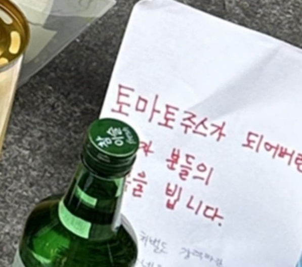 남대문경찰서는 추모 공간에 '토마토 주스가 돼 버린 (희생)자 분들의 (명복)을 빕니다'라는 조롱 섞인 쪽지를 남긴 20대 남성이 경찰에 자수했다고 밝혔습니다. 자수한 20대 남성은 자신이 남긴 쪽지가 온라인상에서 논란이 되고, 언론에 보도되자 전날 경찰에 자수 의사를 밝혔다고 합니다. 경찰 조사에서는혐의를 모두 인정했다고 합니다.