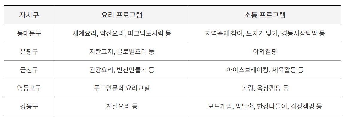 동대문구, 은평구, 금천구, 영등포구, 강동구 (다른 자치구 거주자 참여 가능)