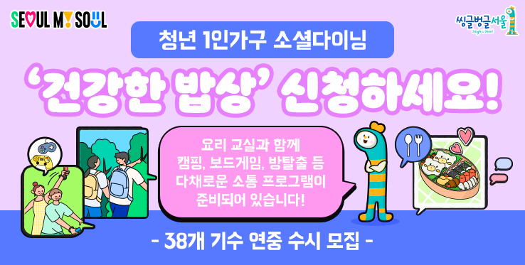 서울시가 청년 1인가구의 건강한 밥상을 지원하기 위해 무료 요리교실을 운영합니다. 만 19~39세 서울시 거주 또는 서울시 생활권 청년 1인가구면 신청이 가능하며 1기수를 16~24명으로 모두 4번의 프로그램으로 요리 강습을 진행합니다. 자세한 모집 내용은 아래와 같습니다.