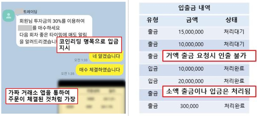 B씨는 A씨에게 더 큰 돈을 벌기 위해서는 투자금을 높여야 한다고 부추겼고, A씨는 차차 입금액을 늘려 총 투자금이 수천만 원 단위에 이른 뒤 수익금을 인출하려고 하자, 해당 거래소는 수수료·세금 등 명목으로 수익금의 40%를 추가 입금해야 된다며 출금을 거절하고, A씨가 항의하자 투자방에서 A씨를 강제 퇴장시키고 연락을 차단합니다.