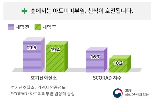 산림 치유는 숲에 존재하는 다양한 환경요소를 활용하여 인체의 면역력을 높이고, 신체적 정신적 건강을 회복시키는 활동이라고 산림청은 설명합니다. 질병을 치료하는 행위는 아니지만 건강을 유지하도록 돕고, 면역력을 높일 수 있습니다. 위 그림 자료에서 보듯 우울증, 고혈압, 아토피 등의 치유에는 적지 않은 도움이 됩니다.