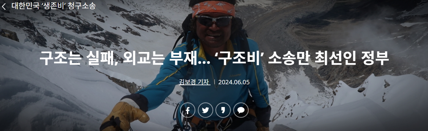정권이 바뀌었다. 윤석열 대통령 취임 21일 만인 2022년 5월31일 정부는 광주광역시산악연맹(약2500만 원)과 김홍빈 원정대 대원 5명(약 4300만 원)에게 총 6800여만 원을 청구하는 소송을 제기했다. 김 대장을 구조하느라 썼던 비용을 내놓으라는 소송이다. 원고는 대한민국, 소관청은 외교부, 법률상 대표자는 당시 법무부 장관 한동훈. 광주MBC를 시작으로 광주 지역언론에서 주로 이 소식을 전했다.