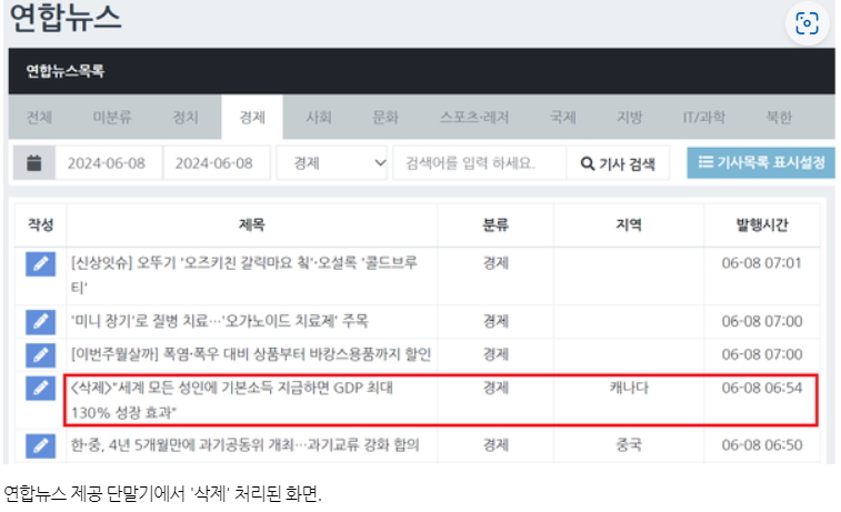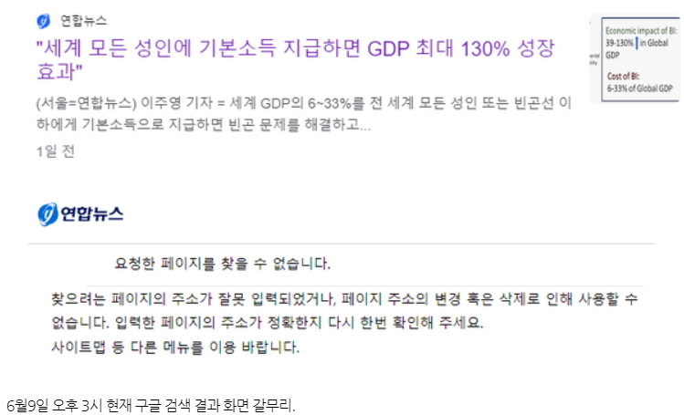 연합뉴스는 지난 8일 오전 6시54분에 뉴스 단말기를 통해 공개된 “세계 모든 성인에 기본소득 지급하면 GDP 최대 130% 성장 효과” 제목의 기사를 ‘삭제’ 처리했다. 연합뉴스 단말기에서 기사를 클릭하면 “이 기사는 삭제되었으니 사용하지 마십시오”라고 나온다. 연합뉴스 홈페이지와 네이버, 다음 등 국내 포털에서는 9일 오후 현재 이 기사가 검색되지 않고 있다. 구글 검색 결과 기사 제목이 나오지만, 클릭하면 “요청한 페이지를 찾을 수 없습니다”라고만 나온다.