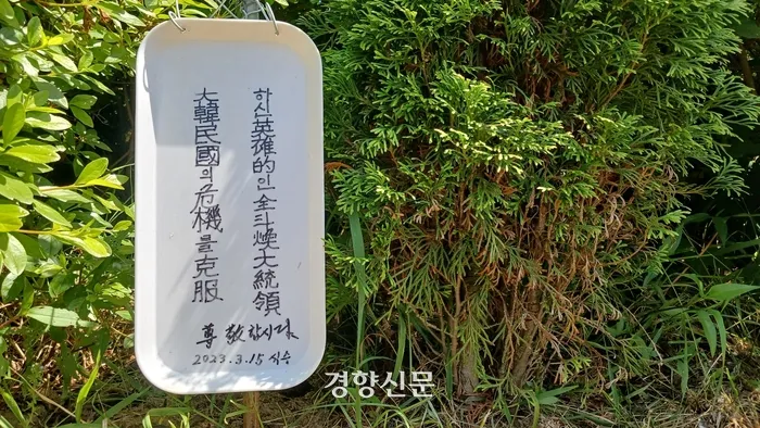 팻말 옆으로 높이 1m 남짓의 측백나무가 자랐다. 팻말은 나무 심은 것을 기념해 세운 것으로 보인다. ‘2023. 3. 15’. 팻말에 적힌 식수 일자다. 군 공공시설물인 전씨 생가에 누군가가 나무를 심고 그를 미화하는 내용의 팻말을 설치했는데도 합천군은 1년 넘도록 아무런 조처도 하지 않았다. ‘전두환 우상화’의 씨앗이 묵인과 방치 속에 자란 것이다.