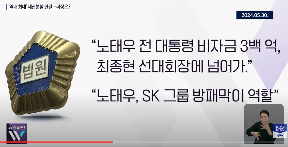경향신문은 6월 2일 법원이 지난달 30일 최태원 SK회장과 노소영 아트센터 나비 관장의 이혼소송 항소심에서 1심의 20배가 넘는 재산분할액(1조3808억원)을 노 관장에게 지급하라고 판결한 데에는 노 관장의 선친인 노태우 전 대통령의 이른바 ‘선경(SK의 전신) 비자금 300억원’의 역할이 주효했다고 보도했다. 이에 대해 경향은 이번 판결로 노 전 대통령이 SK 측에 건넨 비자금 300억원의 실체가 처음 확인된 것이라고 분석했다.