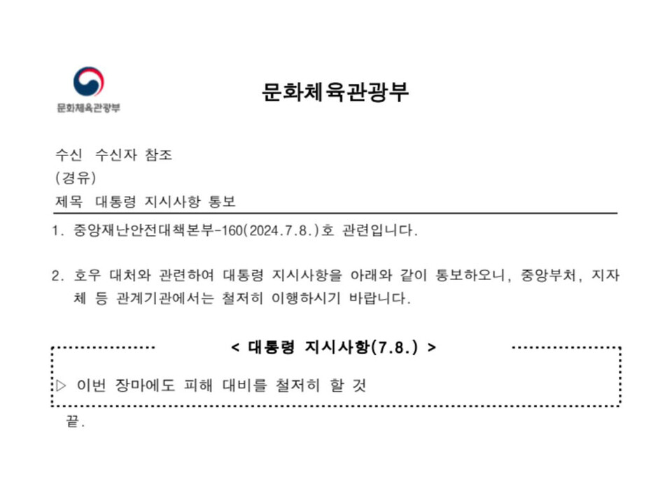 투명사회를위한 정보공개센터는 9일 윤석열 대통령의 지시사항 공문을 공개했다. “호우 대처와 관련해 대통령 지시사항을 아래와 같이 통보하니 중앙부처, 지자체 등 관계기관에서는 철저히 이행하길 바란다”는 공문으로 "이번 장마에도 피해 대비를 철저히 할 것”이라는 한 줄짜리 윤석열 대통령 지시사항을 전했다고 미디어스, 국민일보 등 주요 언론이 보도했다.