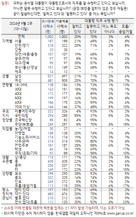 한국갤럽이 9월 10∼12일 전국 18세 이상 유권자 1,002명을 대상으로 조사해 13일 공개한 자료에 따르면 윤 대통령의 직무 수행 긍정 평가율은 직전 조사보다 3%포인트 떨어진 20%, 부정 평가는 3%포인트 오른 70%로 집계됐습니다. 갤럽은 "이번 긍정률 20%는 취임 후 최저치, 부정률 70%는 최고치"라며 "70대 이상, 보수층 성향에서도 부정률이 50% 내외"라고 밝혔습니다.