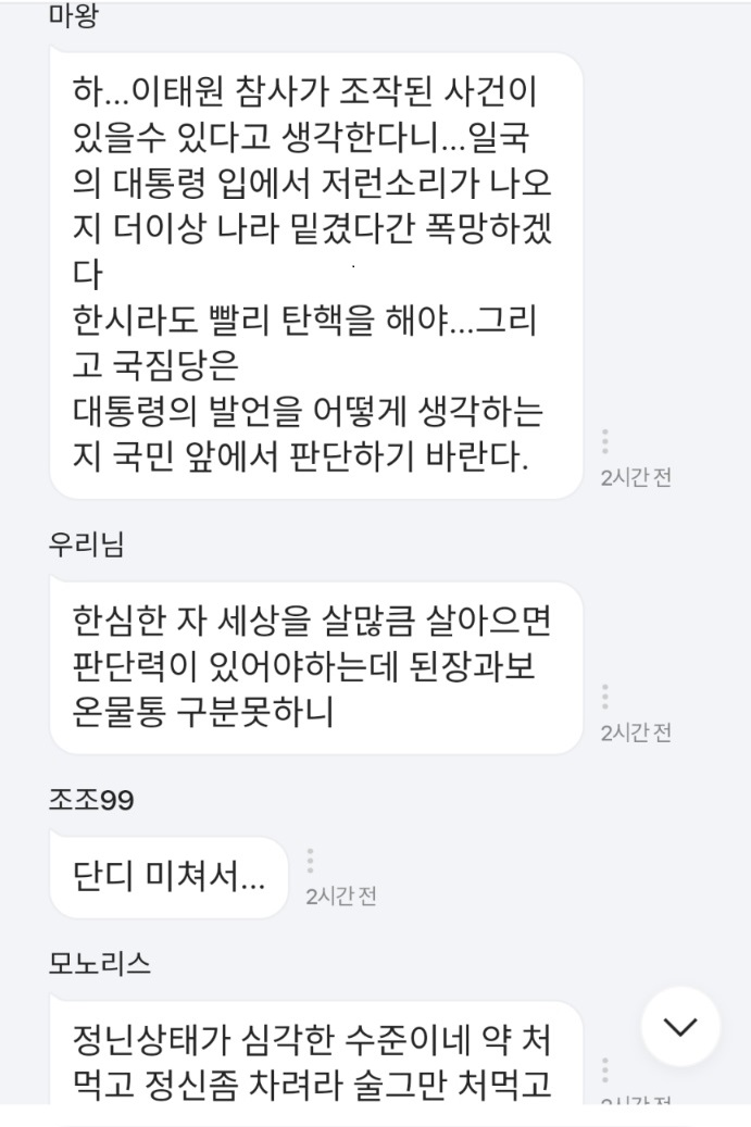 윤석열 대통령이 이태원 사고 조작 가능성이 있다는 취지로 말했다는 내용을 담은 김진표 전 국회의장 회고록 기사에 달린 댓글 반응들입니다. 채널A, 오마이뉴스, 연합뉴스 기사 댓글 일부를 모았습니다.