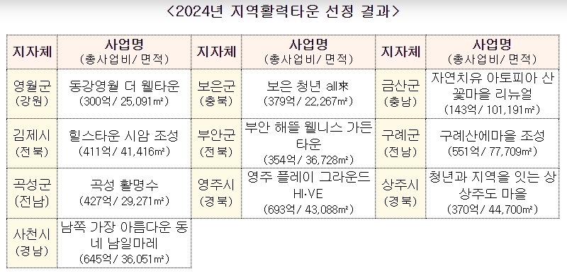 행정안전부와 국토교통부, 교육부, 문화체육관광부, 농림축산식품부, 보건복지부, 해양수산부, 중소벤처기업부 등 8개 부처는 2024년도 지역활력타운 공모 결과 10개 사업을 선정하였다.