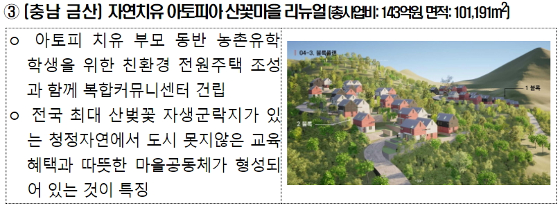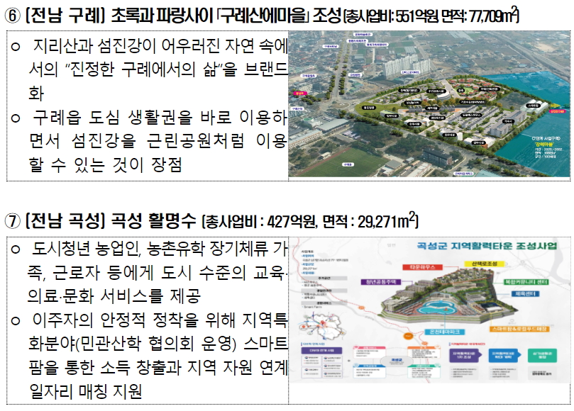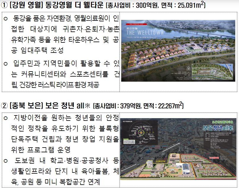 영월군, 금산군, 구례군은 대도시 은퇴자, 귀농·귀촌인을 위한 타운하우스 및 공공 임대주택, 친환경 전원주택과 복합 커뮤니티센터를 갖춘 특색있고 품격있는 주거환경을 조성한다. 부안군, 곡성군, 상주시에서는 농산업 창업을 희망하는 청년들의 안정적인 지역정착을 지원하고, 스마트팜을 통한 소득 창출과 지역자원을 연계하여 일자리 매칭에 나선다. 보은군에서는 지방이전을 원하는 청년들을 위해 블록형 단독주택을 건립하고 청년 창업 지원을 위한 프로그램을 운영한다.