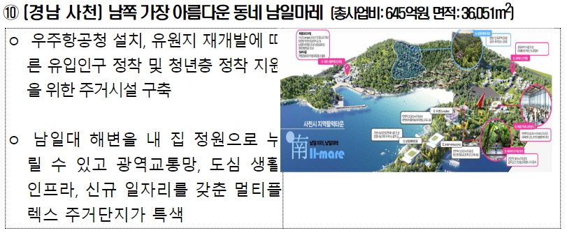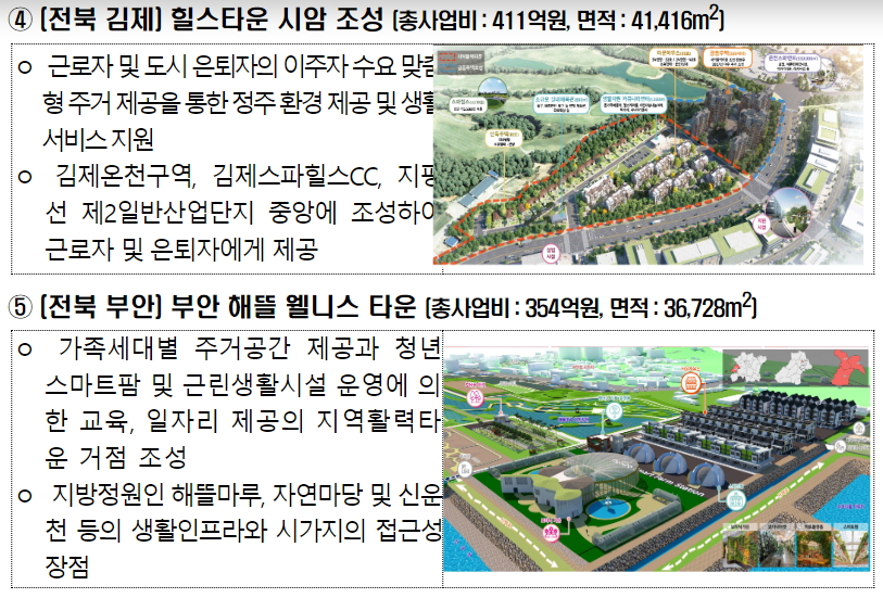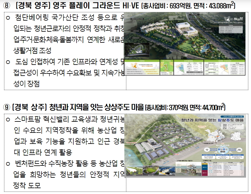 김제시, 영주시는 지평선 제2일반산업단지와 첨단베어링 국가산단 조성 등으로 유입되는 청년 근로자의 안정적 정착을 위해 주거·문화·체육·돌봄을 연계한 새로운 생활거점을 조성한다. 사천시는 우주항공청 설립으로 유입되는 청년층의 정착 지원을 위해 도심생활 인프라, 신규 일자리를 갖춘 멀티플렉스 주거단지를 구축한다.