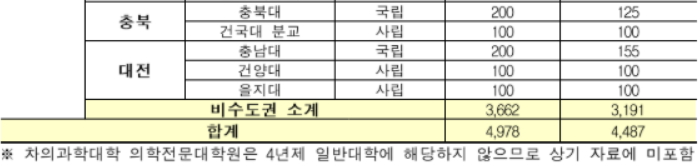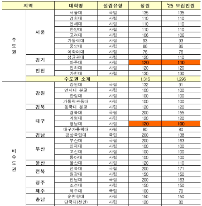5월 24일 한국대학교육협의회는 대학입학전형위원회 회의를 통해 2025학년도 대학입학전형 시행계획 변경사항을 심의, 승인하였다. 이로써 27년만에 전국 의대 정원이 1,509명 증원되어 2025학년도에는 40개 의과대학에서 총 4,567명을 모집하게 된다. 세부사항은 다음과 같다.